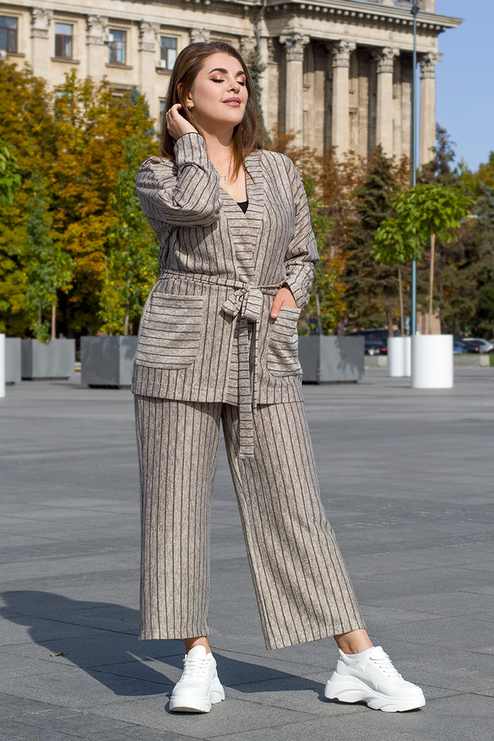 Трикотажный костюм, состоящий из жакета и брюк. Жакет свободного силуэта без застежки. Накладные карманы. Плечо спущено. Талию подчеркивает навесной пояс. Брюки – кюлоты. Карманы с отрезным бочком. Пояс на широкой резинке. Длина – выше щиколотки. Для того, чтобы купить костюм pl4-327.05 большого размера недорого, пожалуйста добавьте товар в корзину.
