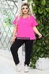 Костюм, состоящий из футболки и брюк. Футболка свободного покроя с коротким цельнокроеным рукавом с манжетами. Перед с подрезами по фасонным линиям, с разрезами внизу. Брюки с широким поясом, карманами «с отрезным бочком». На боковых швах настрочена отделочная тесьма в виде лампасов. Пояс на резинке, со шнурком. Для того, чтобы купить костюм pp1-309.21 большого размера недорого, пожалуйста добавьте товар в корзину.