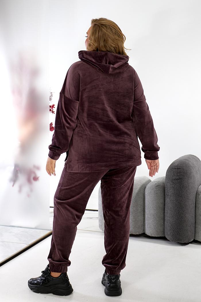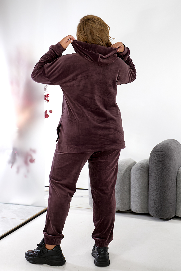 Костюм що складається з джемпера та штанів. Джемпер прямого силуету з довгим рукавом, з капюшоном. Перед джемпера коротше спинки, з розрізами з боків. Штани прямі,пояс на резинці. Кишені з відрізним бочком. Для того, чтобы купить костюм pp1-395.44 большого размера недорого, пожалуйста добавьте товар в корзину.