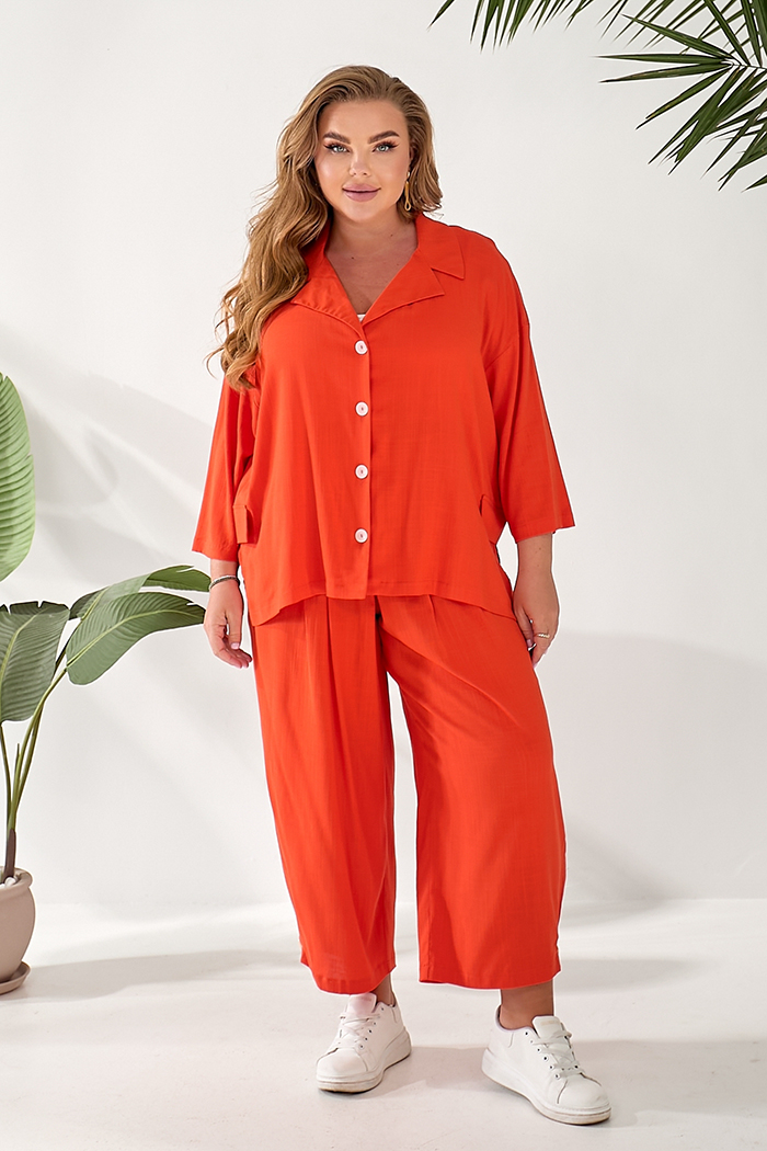 Костюм складається з жакету та штанів. Жакет вільного крою із застібкою на гудзики. Оздоблювальні клапани на поличках. Комір з лацканом. Рукав 3/4. У бічних швах розрізи. Штани прямого крою, широкі. На передніх половинках по дві односторонні склади та одна зустрічна, по центру. Внизу штанів зустрічна склада, закріплена гудзиком. Кишені з відрізним бочком. Приточний пояс на резинці. Для того, чтобы купить костюм хpl4-802.11 недорого, пожалуйста добавьте товар в корзину.